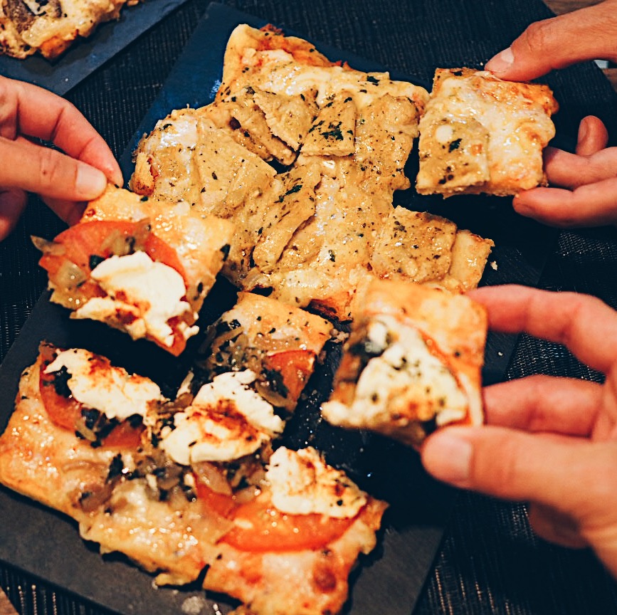En el mundo de las pizzas, destacamos por nuestra masa rectangular, de 1,5cm de altura, fusión entre focaccia y pizza.